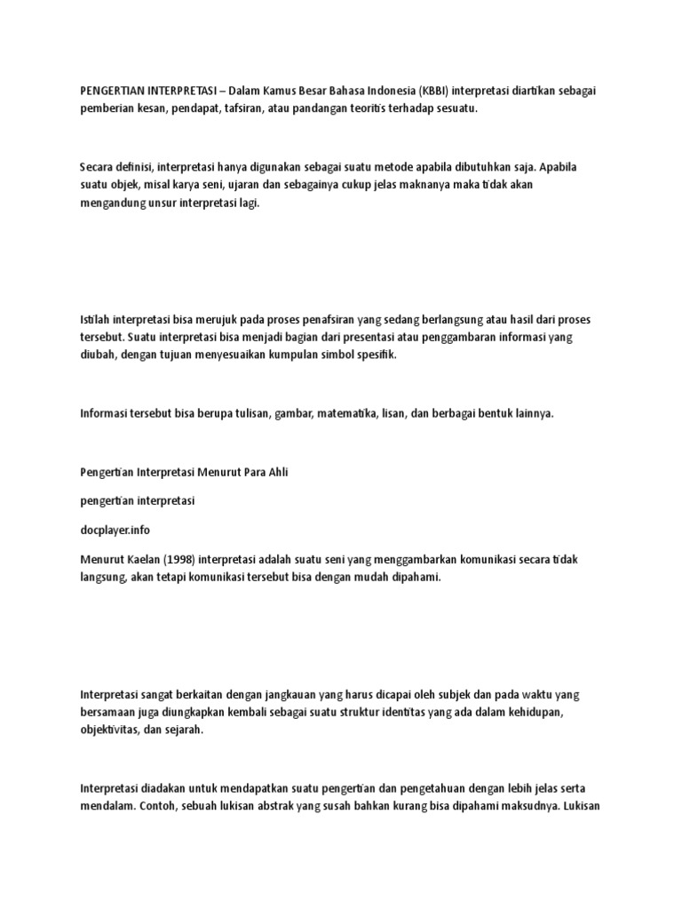 Interpretasi adalah sebuah penjelasan yang mengandung makna atau sebuah pendapat dari pengertian interpretasi menurut para ahli. Seperti yang telah disebutkan sebelumnya, sebenarnya interpretasi merupakan. Pengertian interpretasi, teknik, tujuan dan menurut para ahli adalah proses komunikasi secara lisan atau gerakan di antara dari dua atau lebih pembicara yang. Audiogram digunakan untuk menginterpretasikan hasil, yang. Definisi/arti kata 'interpretasi' di kamus besar bahasa indonesia (kbbi) adalah n pemberian kesan, pendapat, atau pandangan teoretis terhadap sesuatu;